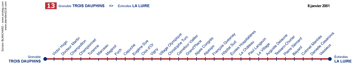 Avec l'arrivée du tramway à Échirolles, la ligne 13 abandonne la desserte de Comboire à la nouvelle ligne 11. L'arrêt Les Ruires est déplacé pour être aussi desservi par la ligne 11 et est renommé François Quesnay (l'orthographe en "-ais", fausse, sera utilisée jusqu'en janvier 2001). Échirolles Mairie devient Auguste Delaune et Auguste Delaune devient Tessaro-Chorier.