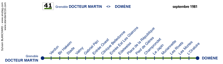 La ligne 41 est limitée à Docteur Martin, dans le centre-ville, et elle passe par l'avenue Gabriel Péri, au lieu de Ambroise Croizat, desservant Gabriel Péri, Clinique Belledonne et Les Glairons.